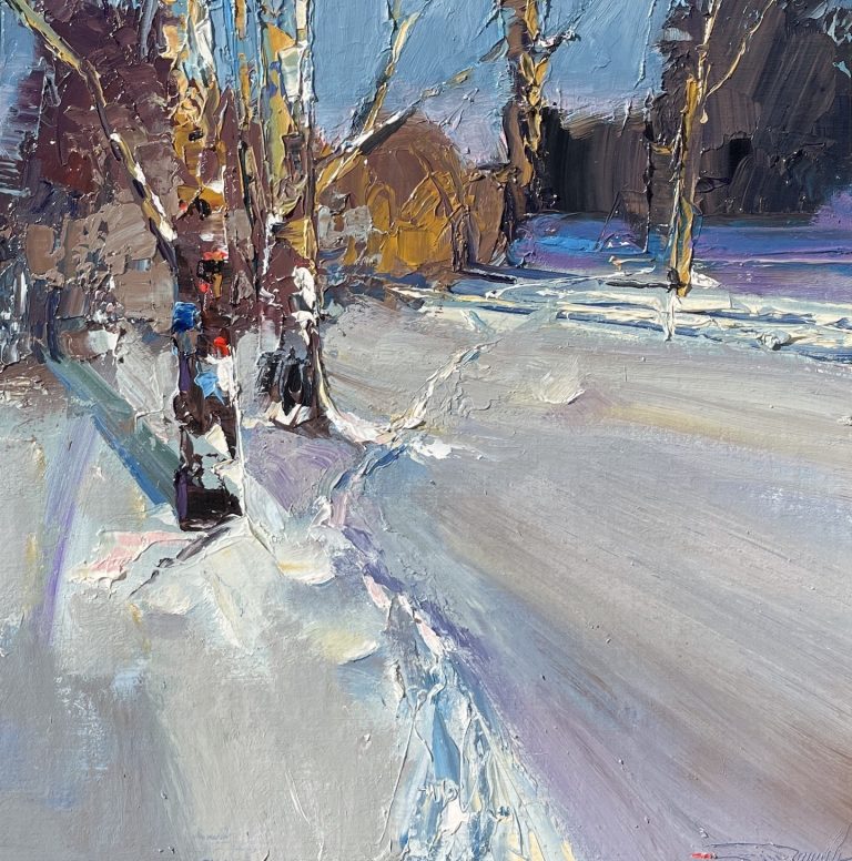 Charles Warren Mundy Late Light, Backyard Snow Oil on linen 12 x 12 inches