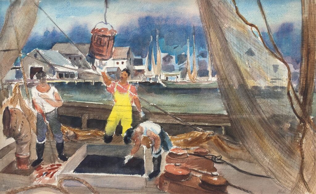 Harry Davis Gloucester Fishermen Sold Watercolor 11 1/2 x 18 inches
