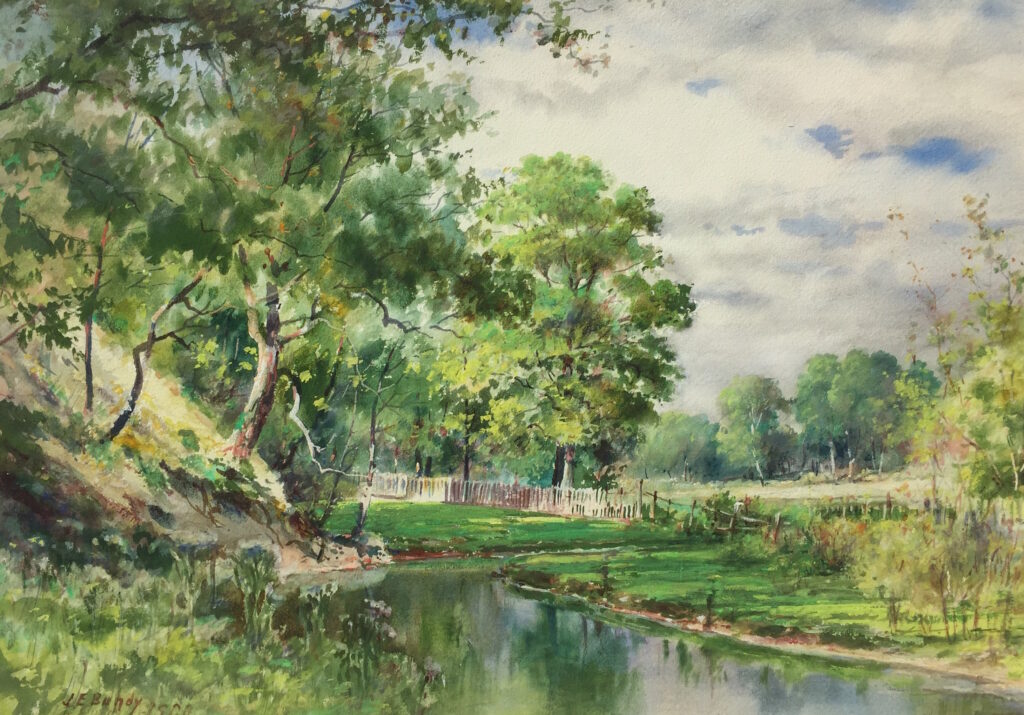 John Elwood Bundy The Fence by the Stream Sold Watercolor 15 x 21 inches