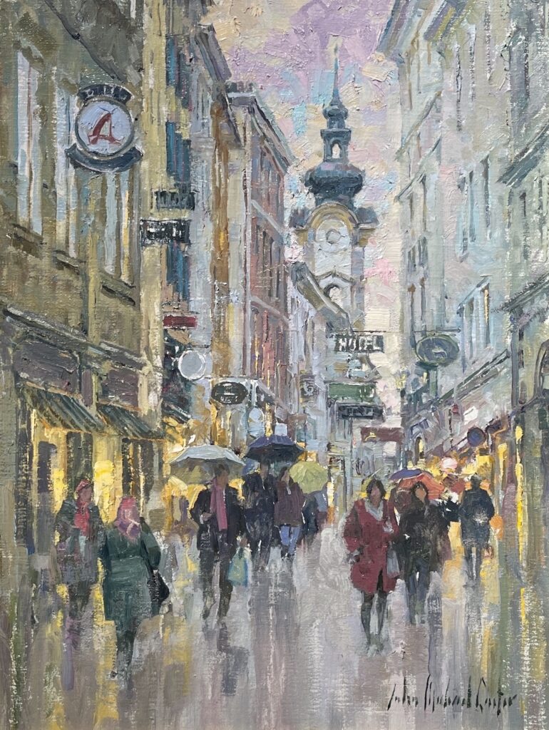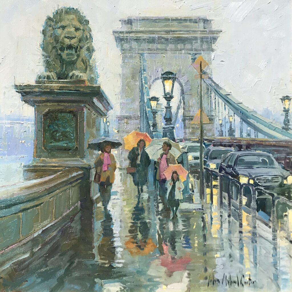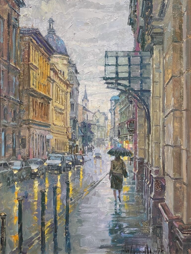 John Michael Carter Budapest in the Rain Oil on panel 16 x 12 inches