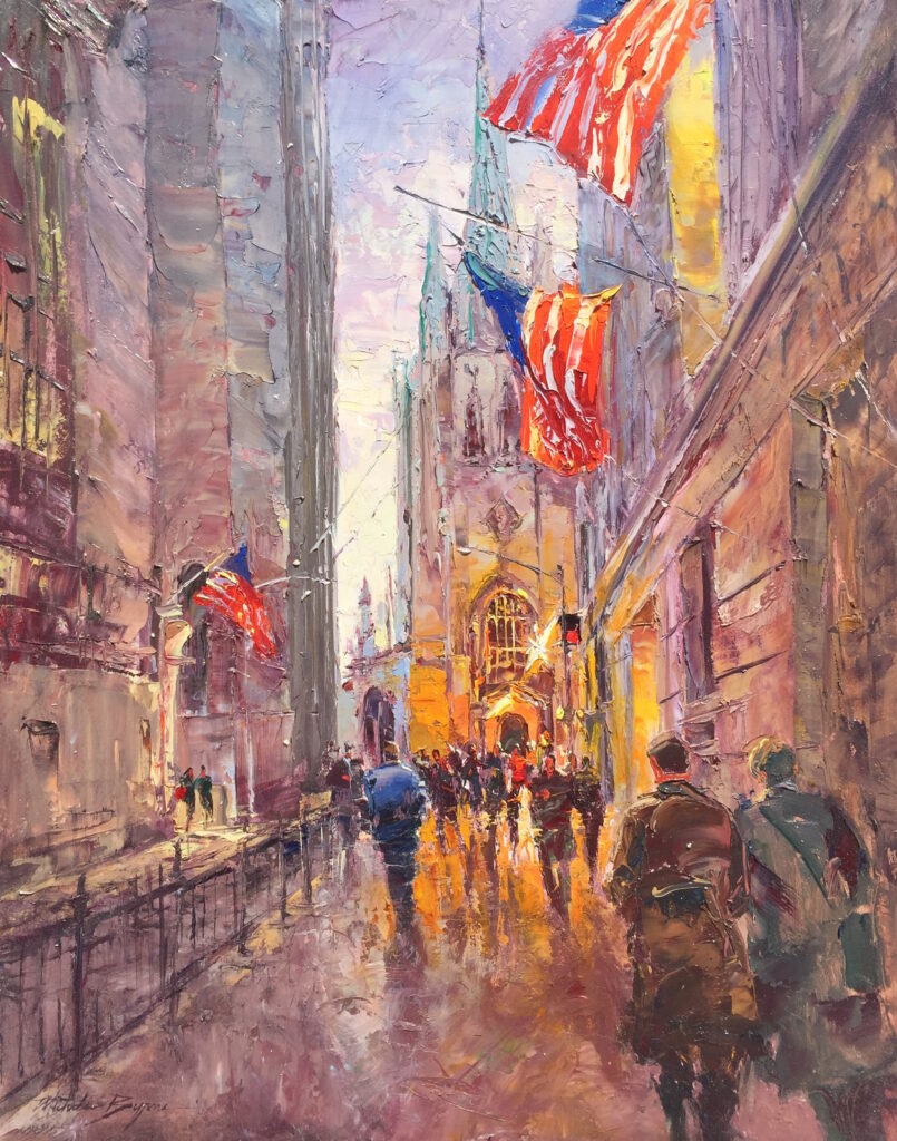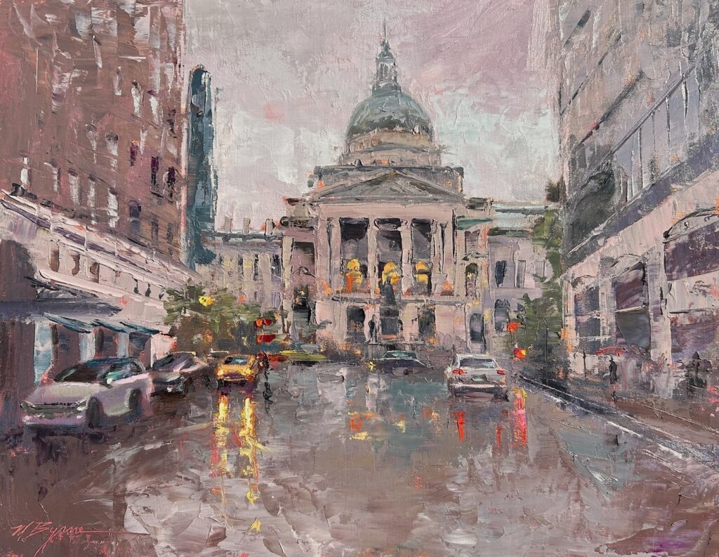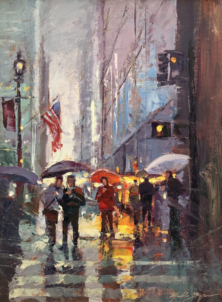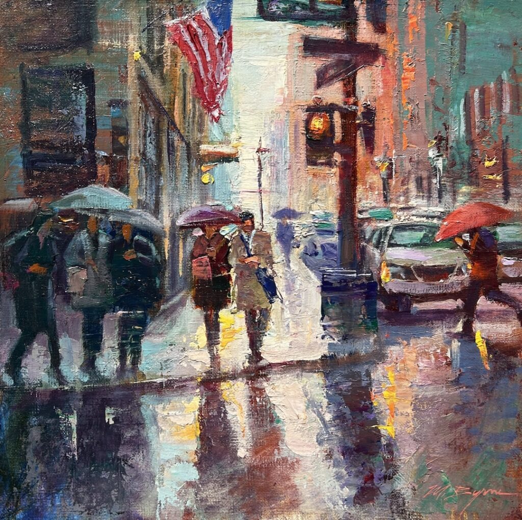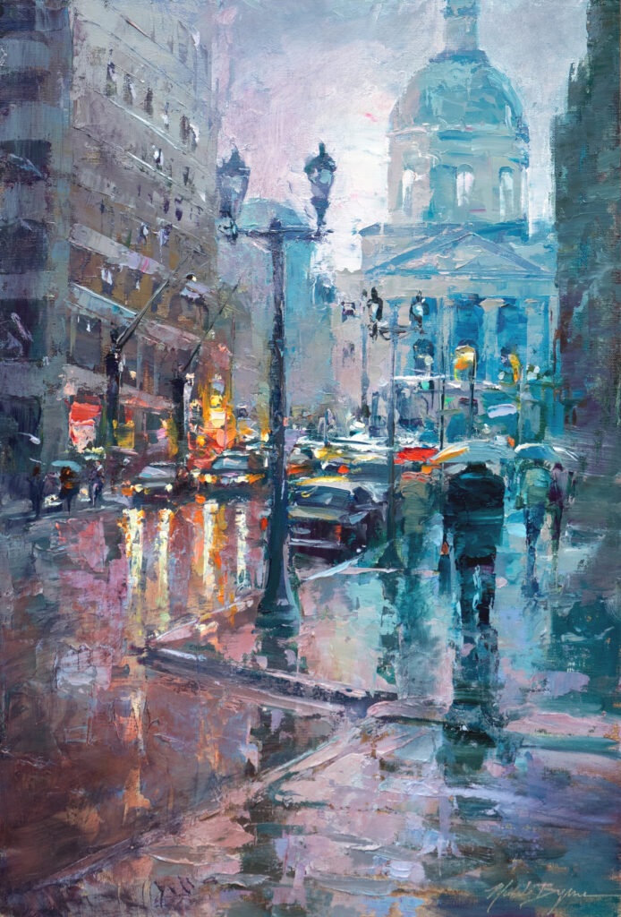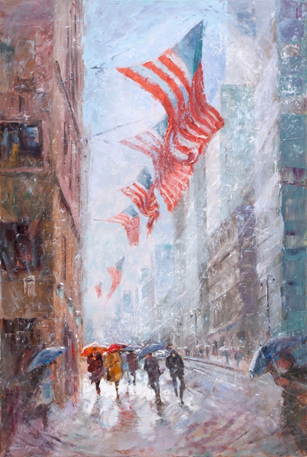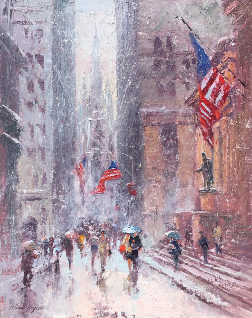 Michele Byrne Rainy Evening on Wall Street Sold Oil on linen 24 x 30 inches