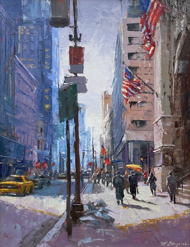 Michele Byrne Snowfall on Wall Street Sold Oil on board 20 x 16 inches