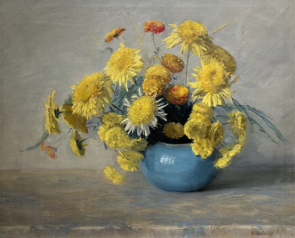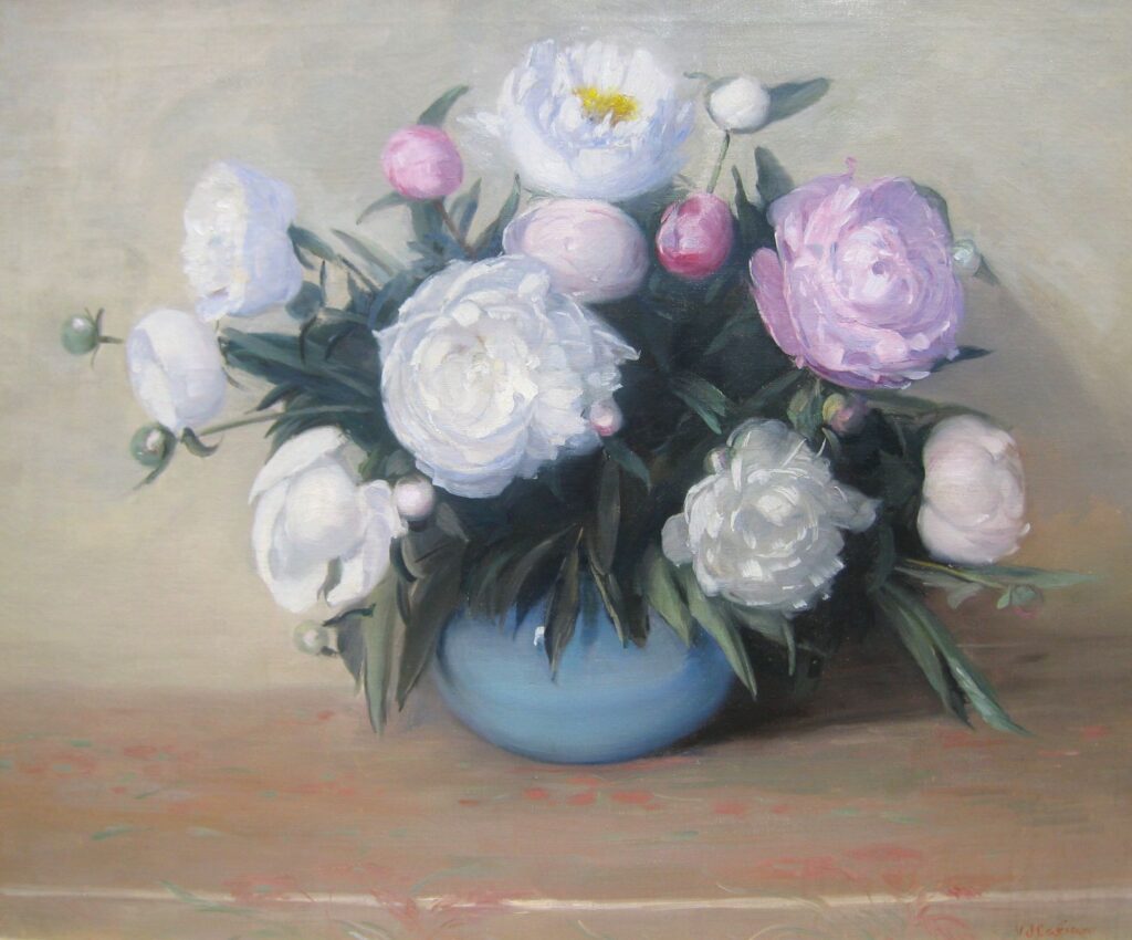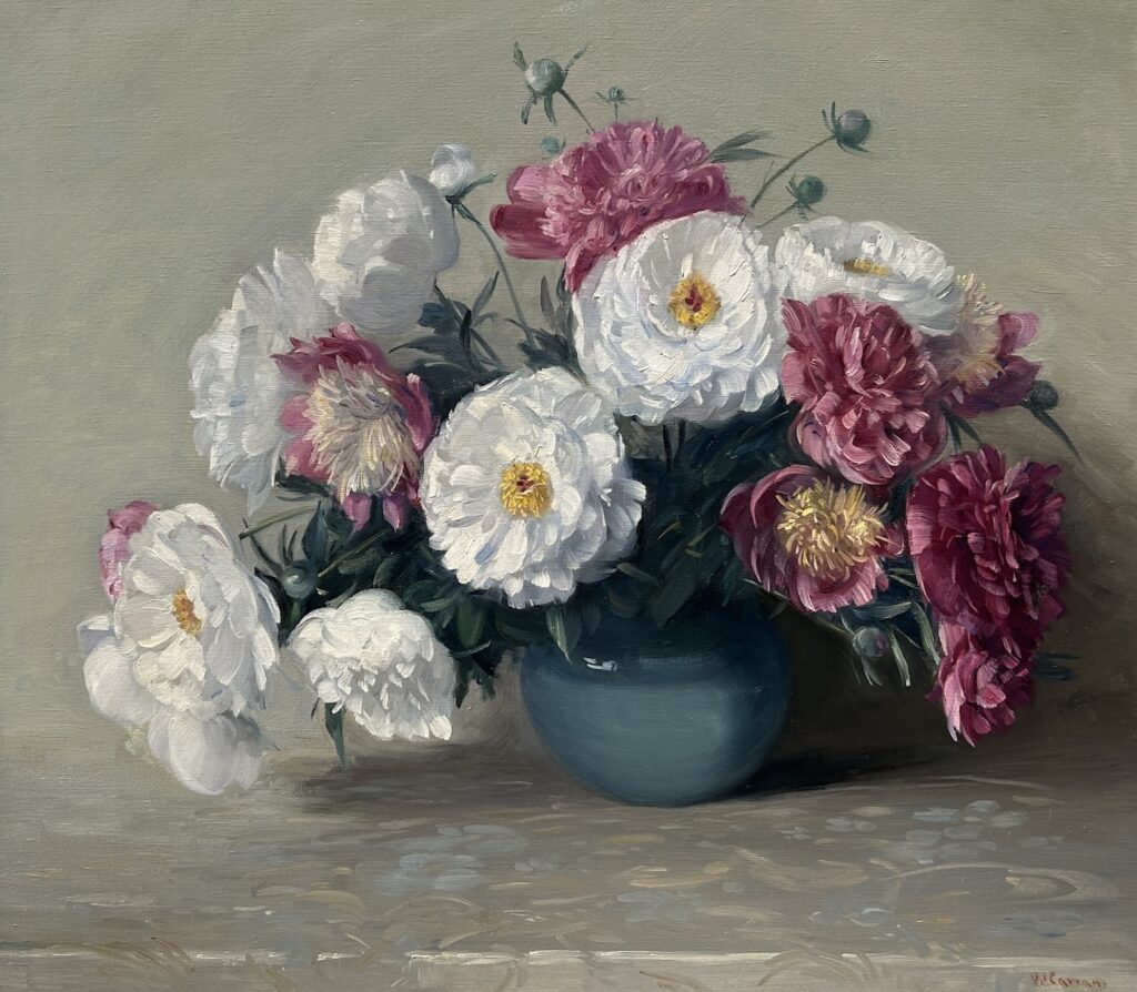 V. J. Cariani Peonies in Blue Vase Sold Oil on canvas 25 x 30 inches