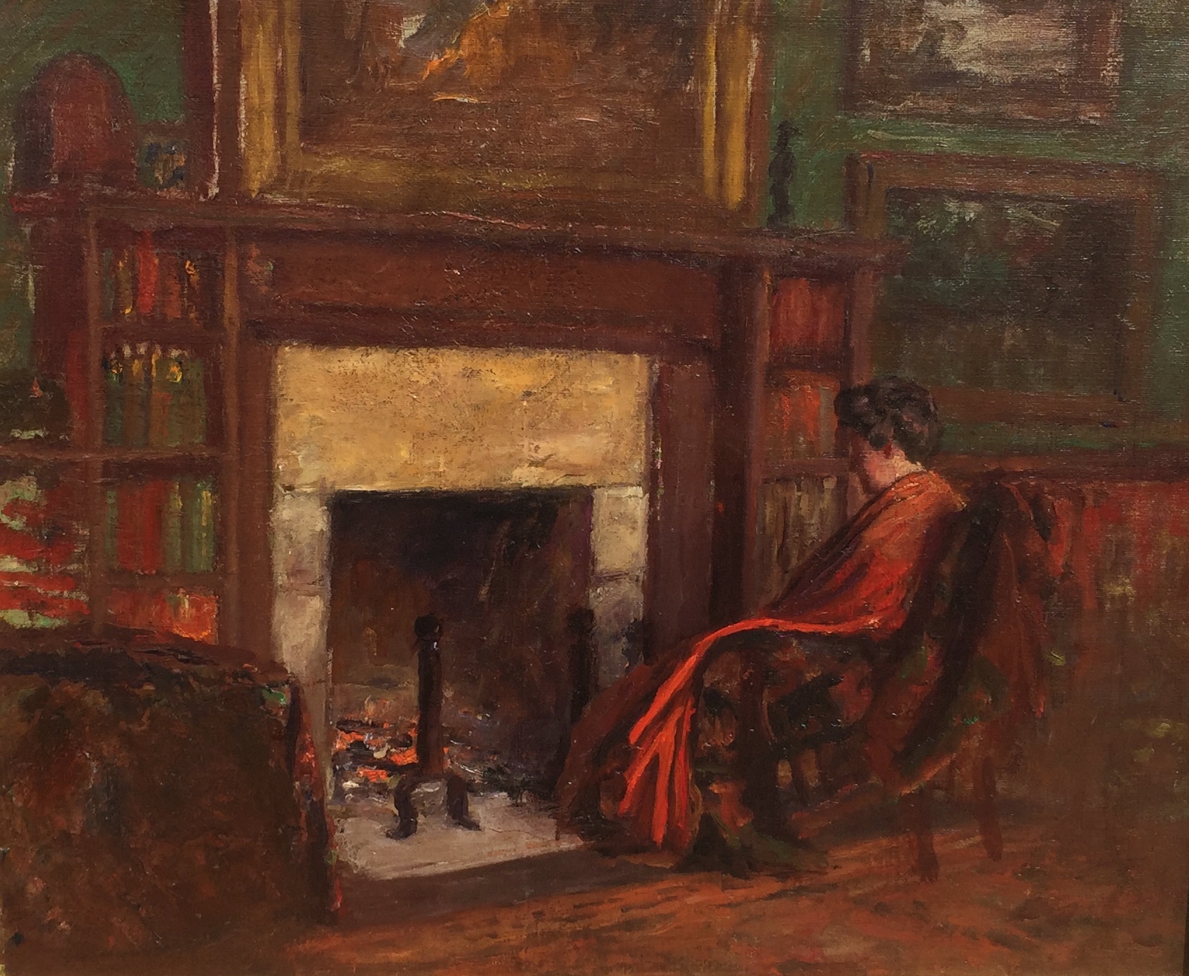 This is a rare subject showing the artist's wife in their Brown County home "The House of the Singing Winds." This home is now a state historic site and still appears today as depicted in the painting.