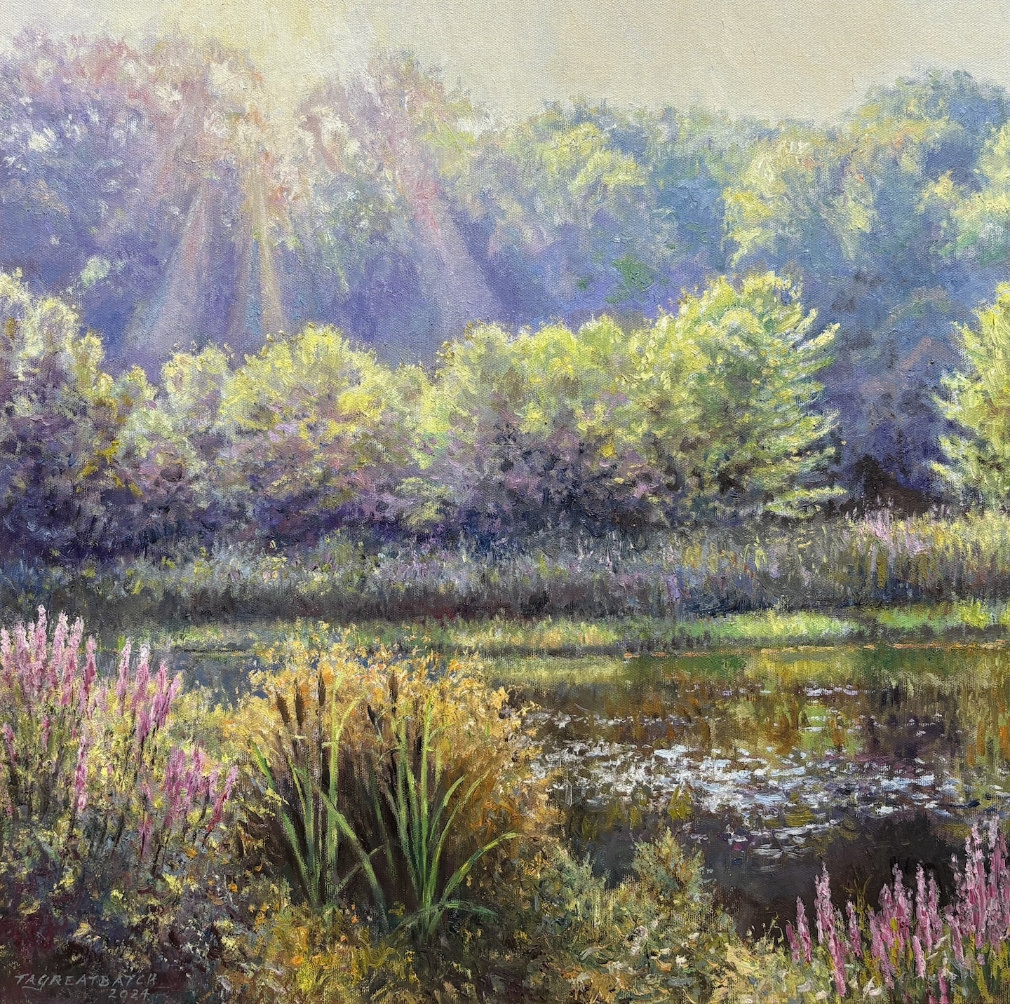 From the artist: "Located in Brown County, Indiana, Yellowwood State Forest has become a favorite painting spot in recent years. This early morning backlit view is from the largest cove on the lake. Young sycamores line the midrange while reeds, marginals and the pink spired purple loosestrife fill the foreground." Fine 22K gold gilt hand carved frame.