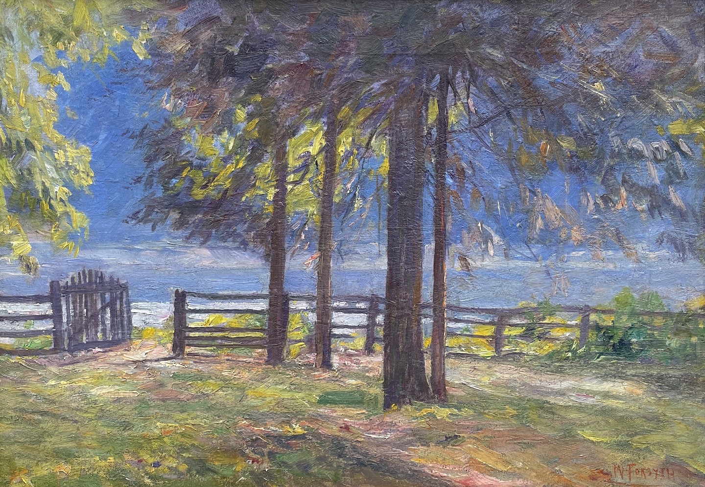 Titled and dated on stretcher verso. From the peak period of the artist's career. Depicts the Ohio River, from Harrison County in southern Indiana, looking over to the Kentucky side.