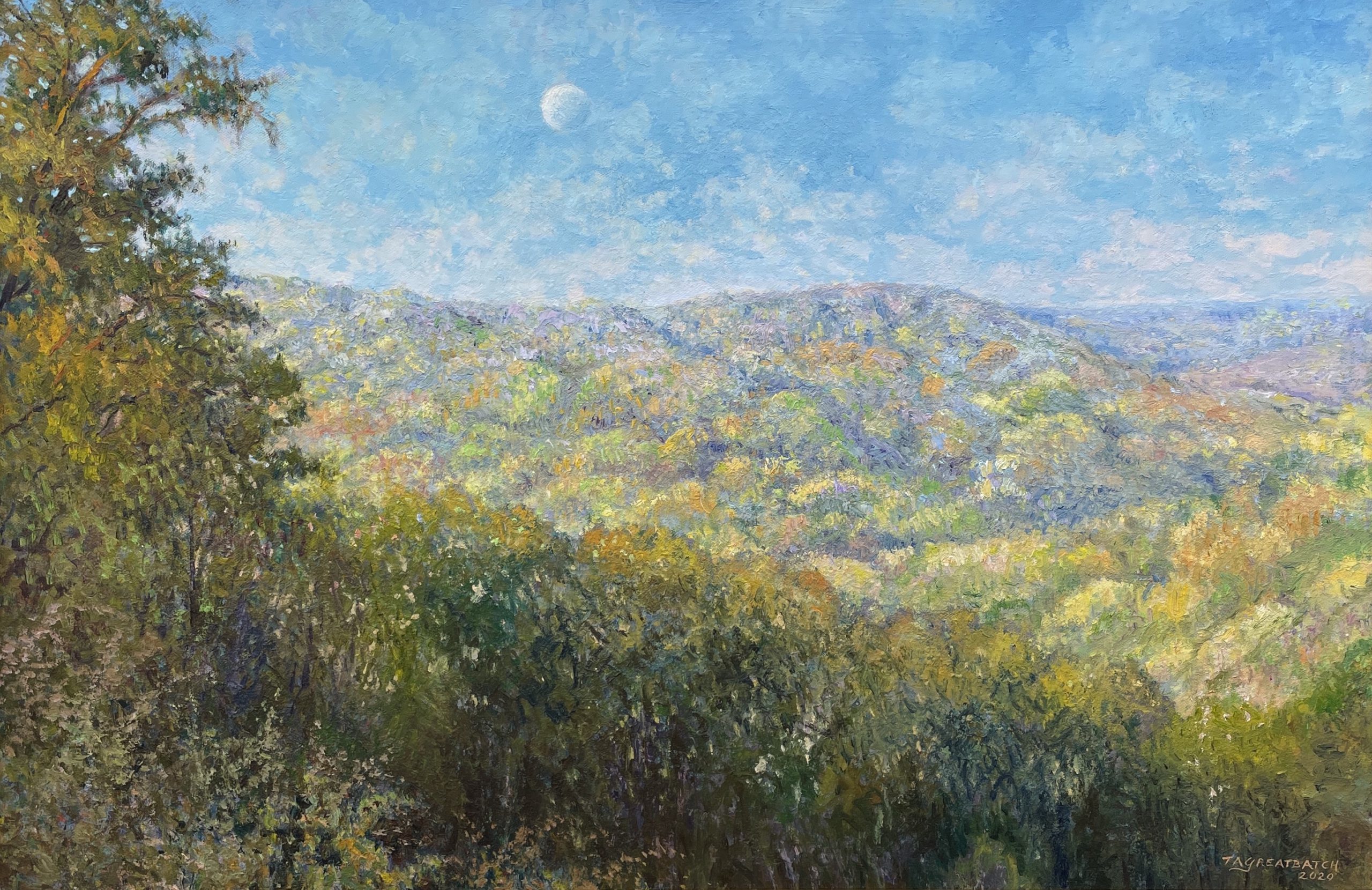 From the artist: "On the morning of October 19th (2019) a beautiful moon hung over the hills at the Guardrail Vista (this view, named by the artist, is located about one mile south of the North lookout, in the Brown County State Park). The deep blue sky was filled with gossamer clouds–never thick enough to obscure the moon. I structured the work so that about a third of the view is in shadow, the morning sun still not high enough to illuminate most of the foreground. The fall colors were just beginning, with touches of pale orange, ochre and yellow-green dotting the sunlit hills." Fine 22K gold gilt hand carved frame.