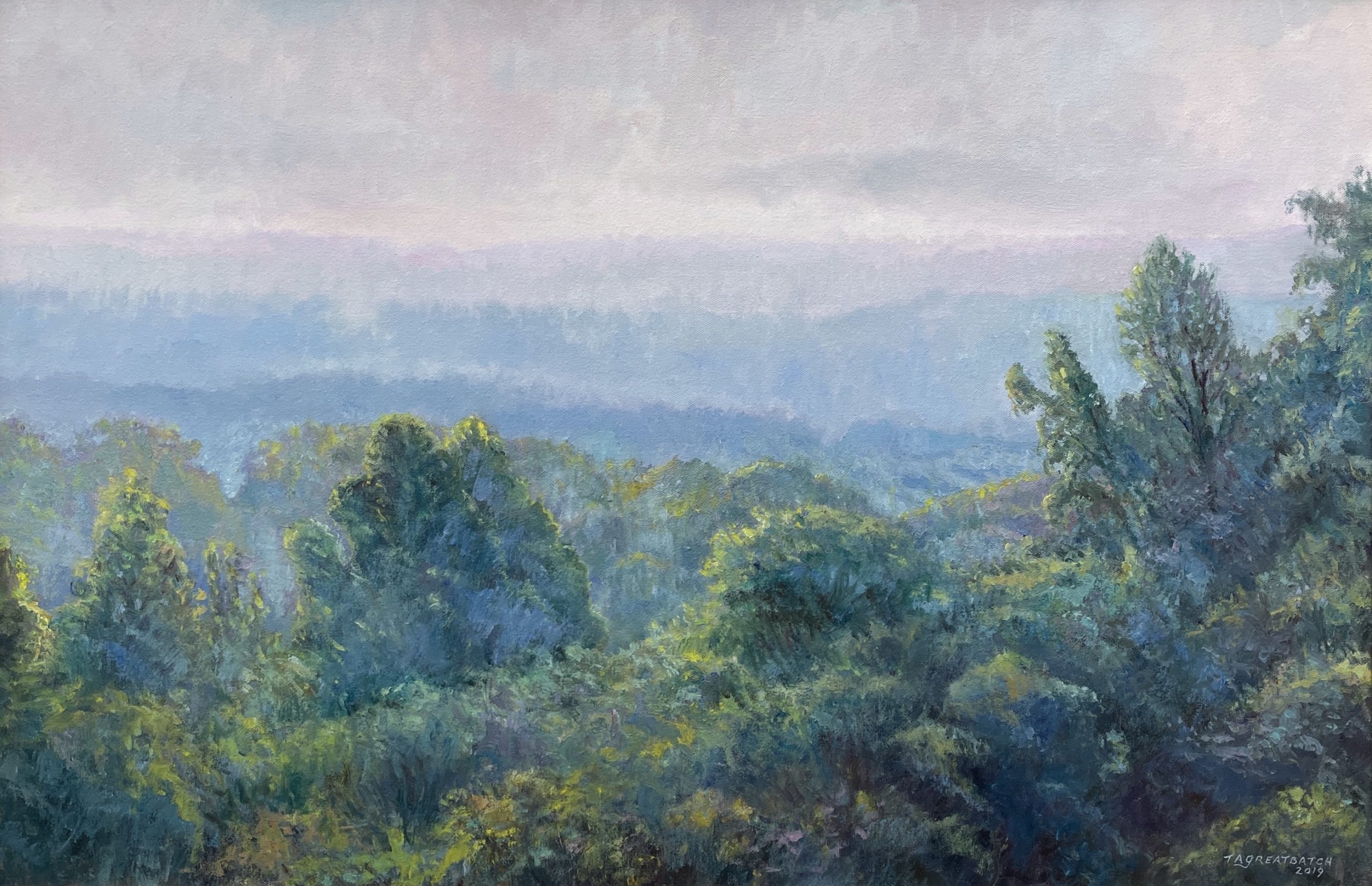 From the artist: "In this work I chose to emphasize the distant hills–looking across the treetops to the three bands of pastel shades towards the horizon. The furthest band, with the pinkish violet color, nearly blended with the dense bank of fog in the right sky. Small patches of blue sky can be seen trying to poke through the atmosphere." Fine 16K gold gilt hand carved frame.