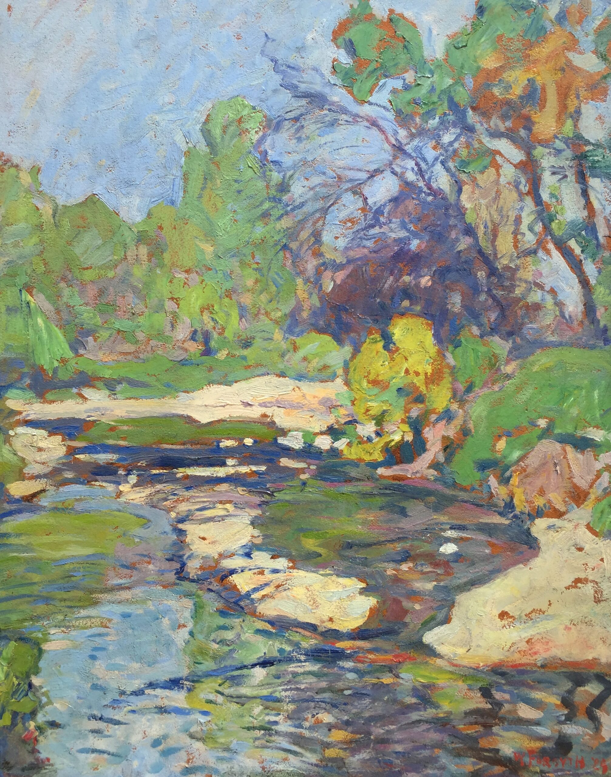 An excellent and larger example of the artist's later period. Perfect condition, and housed in a rare artist-made hand carved silver finish frame. Original artist's label and title verso.