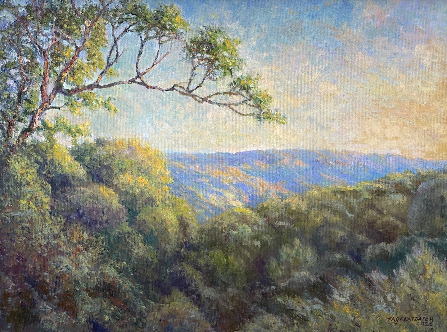 From the artist: "In this mid-August (2019) view, I've omitted the foreground, looking across the treetops to the small section of hillside illuminated by the early evening light. Most of the front trees are in shadow, so the brushwork was kept soft and blended." Fine 22K gold gilt hand carved frame.