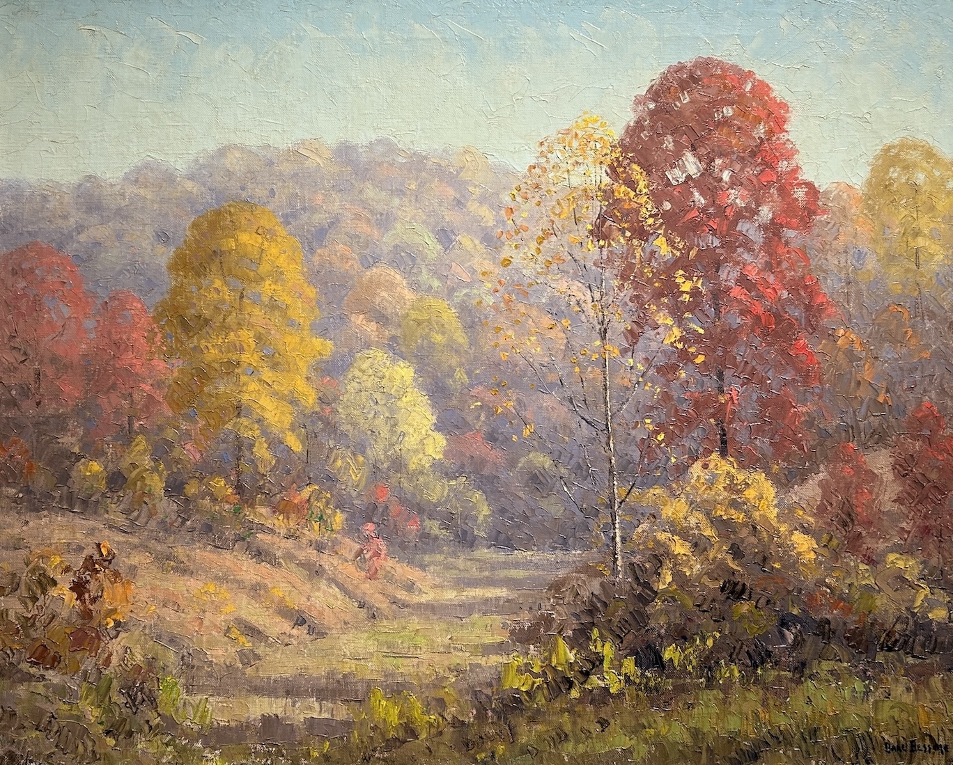Depicts a scene at the foot of Bear Wallow Hill in Brown County, overlooking a ridge that was donated by the Lilly family to Indiana University. In good condition and retaining its original frame. Painted in an unusually robust style, this picture is one of the nicer Bessires we've seen.