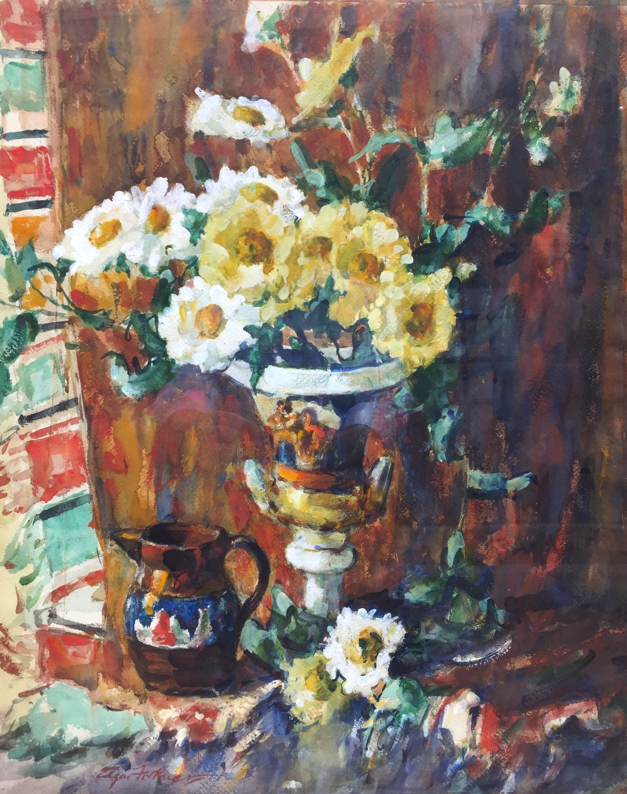 One of the nicer and more complex of the artist's watercolor still lifes. The artist thought highly enough of it to submit it to the 11th International Exhibition of Watercolors held at the Art Institute of Chicago in 1931 (label verso).