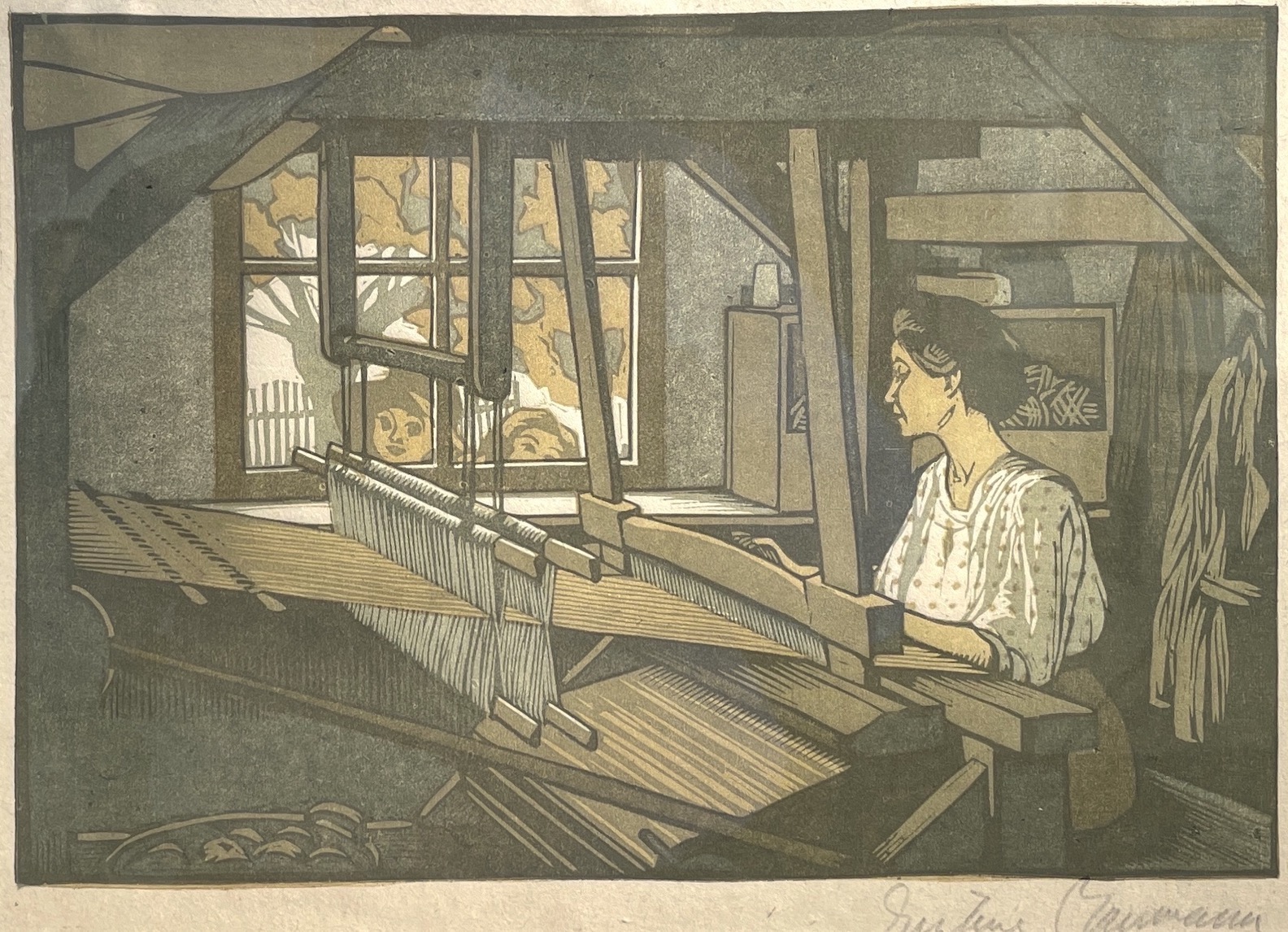 Printed on wove Japan paper in three colors, in an edition of 100. An example of this print may be found in the collections of the Art Institute of Chicago, the Brown County Art Gallery, the Brown County Public Library, the Cleveland Museum of Art, the Indianapolis Museum of Art, the Indiana State Library, the National Museum of American History–Smithsonian, the New Mexico Museum of Art, the Newark Public Library, the Two Red Roses Foundation (St. Petersburg, Florida), and the Worcester Art Museum. Chamberlain 28.