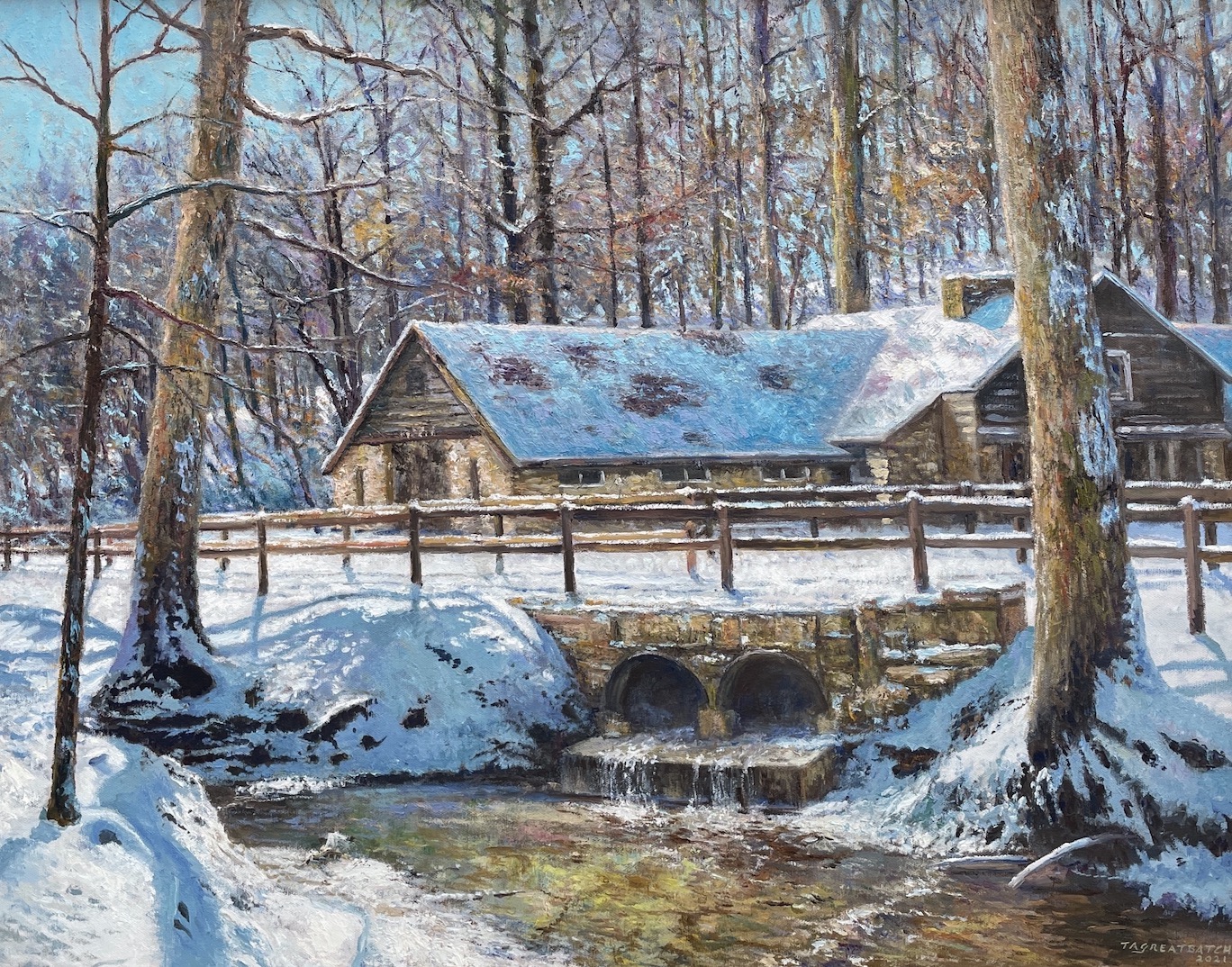From the artist: "Several snowy days in January 2021 provided the opportunity to develop this work. From spring through fall, this area is filled with activity as guests explore the Brown County State Park on guided horseback rides. This "off-season" winter scene was chosen to emphasize the setting in a quieter moment. The native stone and wood plank structure is classic Brown County architecture; and the unnamed creek, with its shadow-filled banks and stone culvert adds significant interest to the foreground." Fine 22K gold gilt frame.